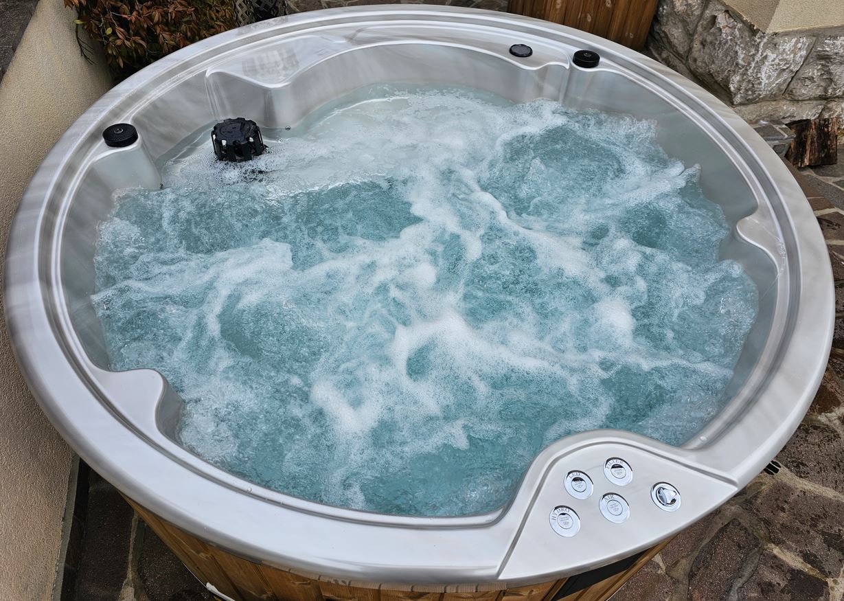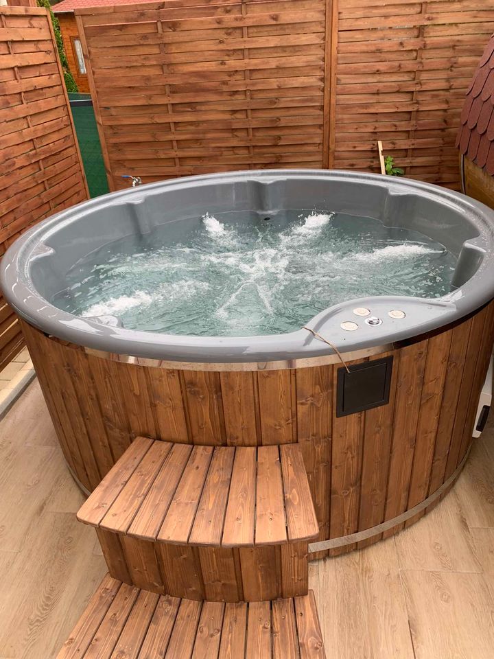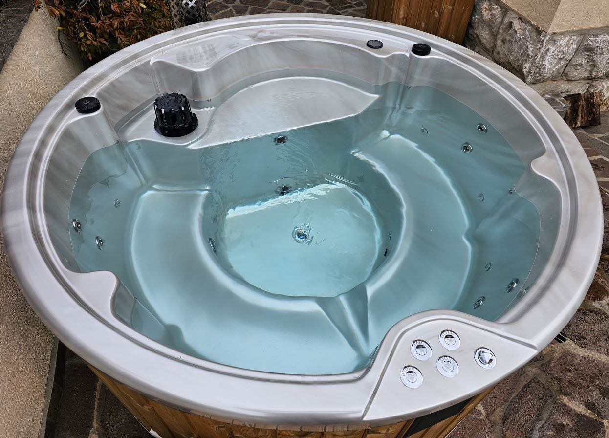 Badestamp i glassfiber med trekledning i ubehandlet grantre. Underramme er impregnert. Ytre diameter er 205 cm og 185 cm innvendig. Høyde 100 cm, dybde 85 cm innvendig. Volum ca 1200 liter. Badestampen passer fint for 4 – 5 personer. Oppvarming tar kun ca 2 – 2,5 timer. Oppvarmingstid varierier i forhold til luft- og vanntemperatur. Også kvaliteten på ved. Badestamp leveres ferdig montert.