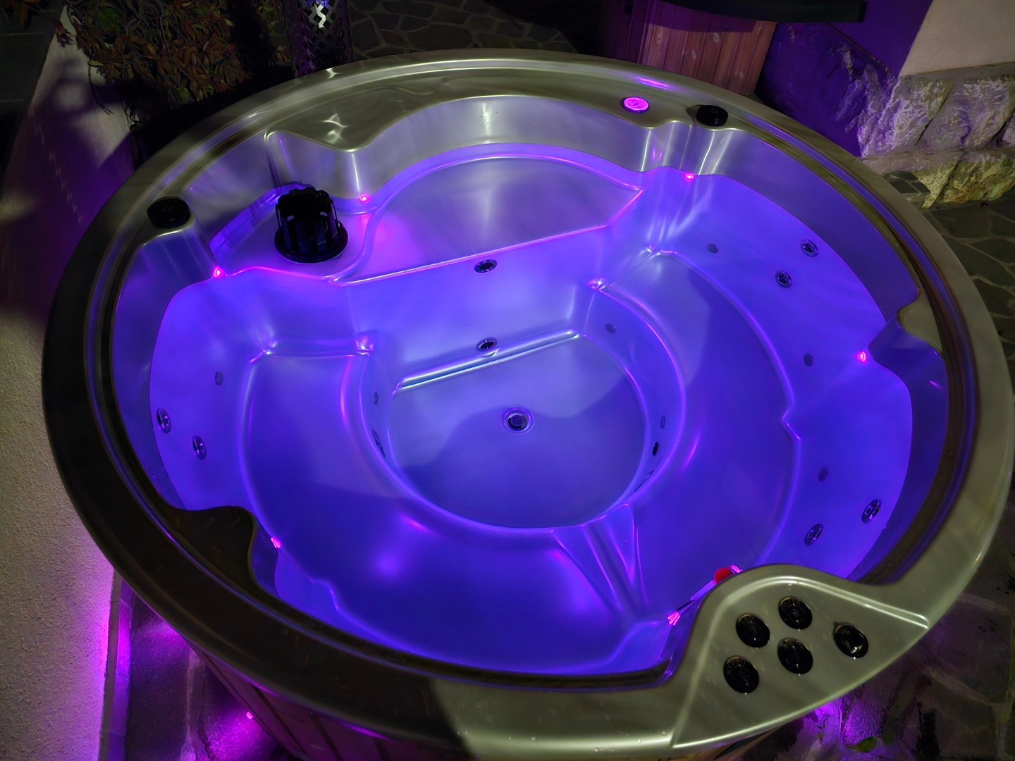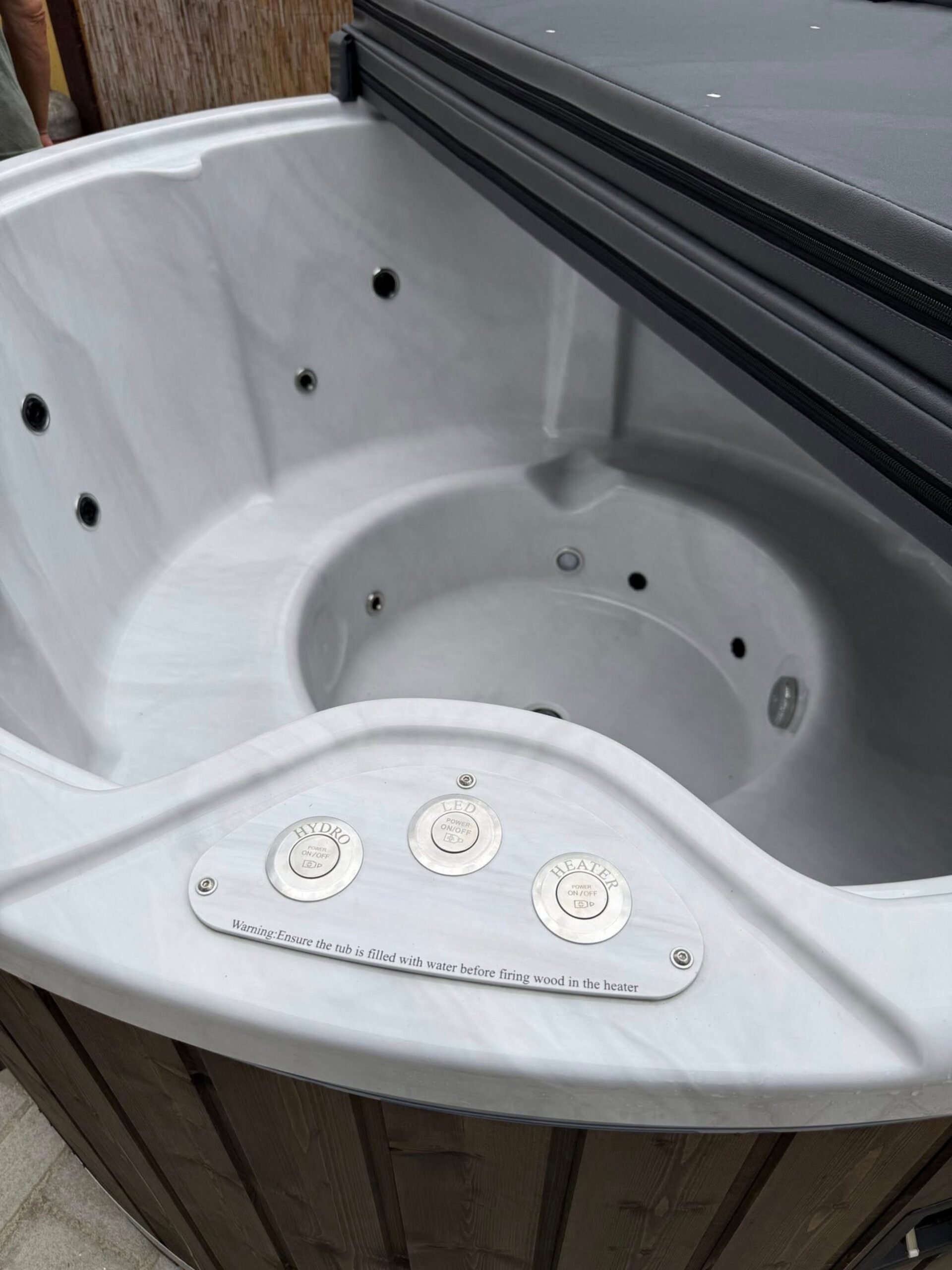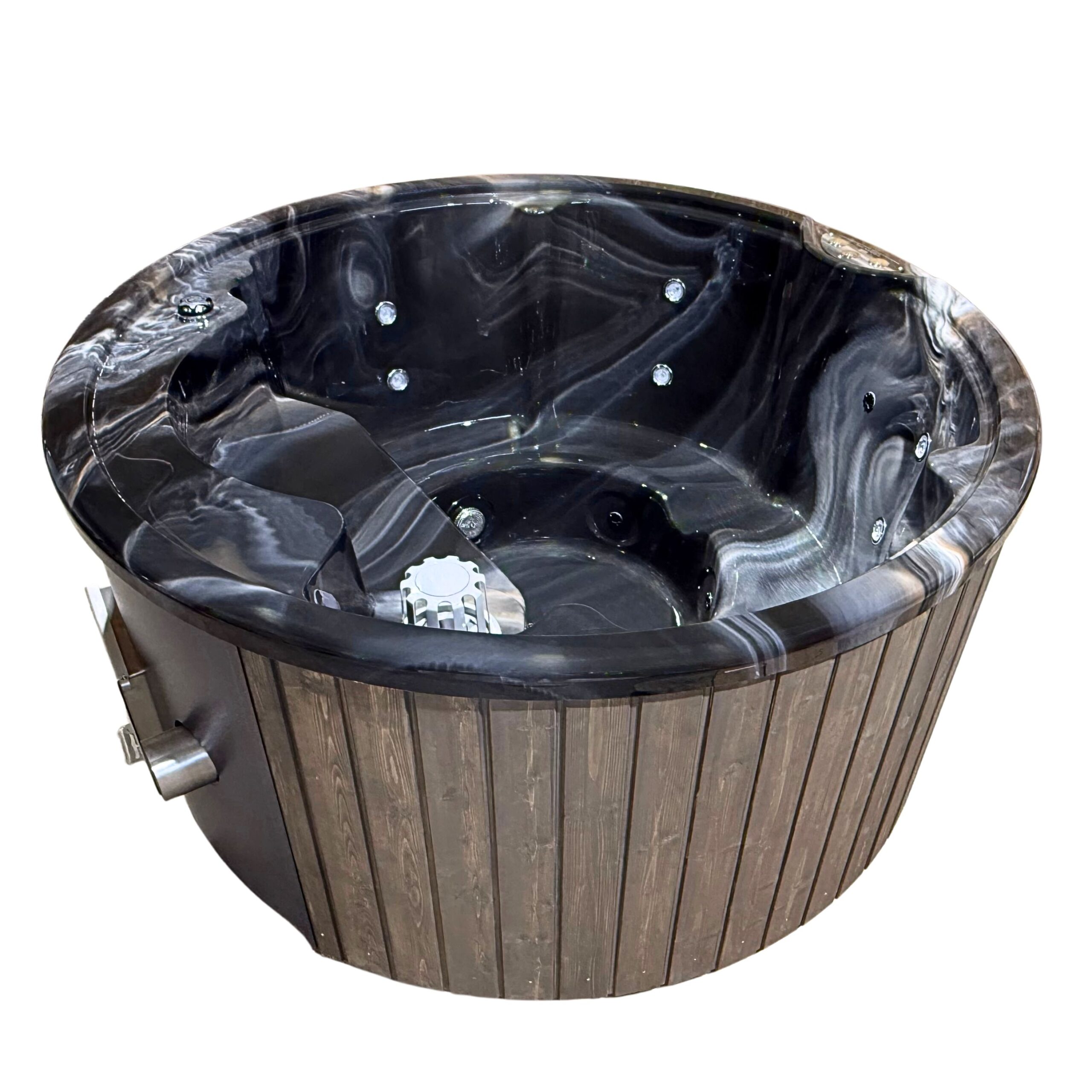 Badestamp i glassfiber med trekledning i ubehandlet grantre. Underramme er impregnert. Ytre diameter er 205 cm og 185 cm innvendig. Høyde 100 cm, dybde 85 cm innvendig. Volum ca 1200 liter. Badestampen passer fint for 4 – 5 personer. Oppvarming tar kun ca 2 – 2,5 timer. Oppvarmingstid varierier i forhold til luft- og vanntemperatur. Også kvaliteten på ved. Badestamp leveres ferdig montert.