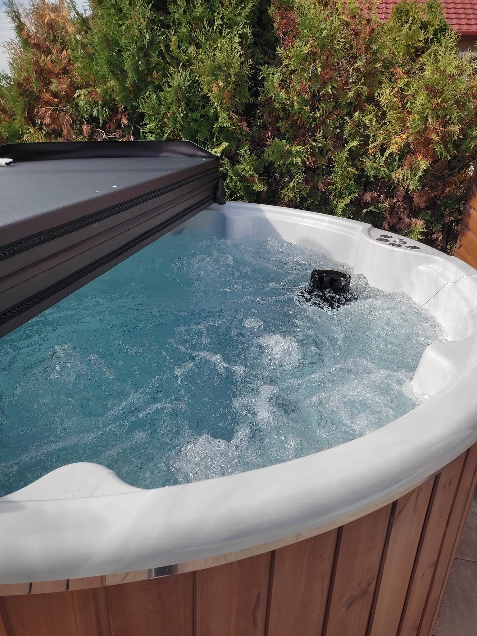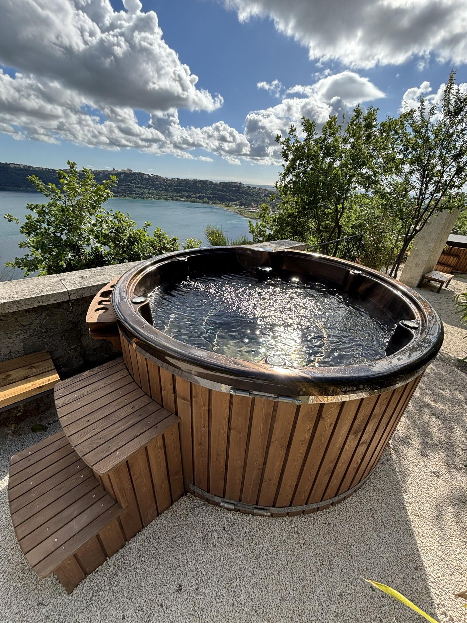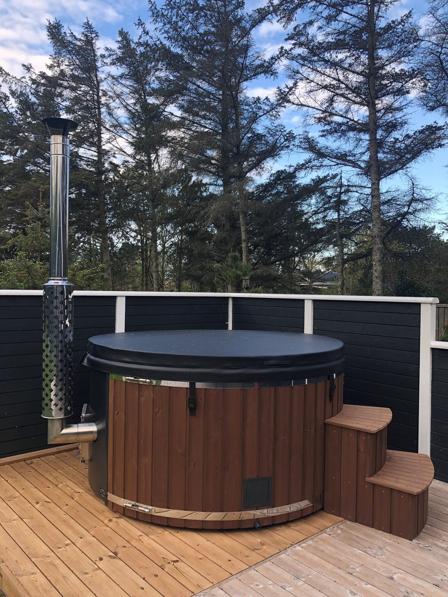 Vedfyrt badestamp med integrert filter.