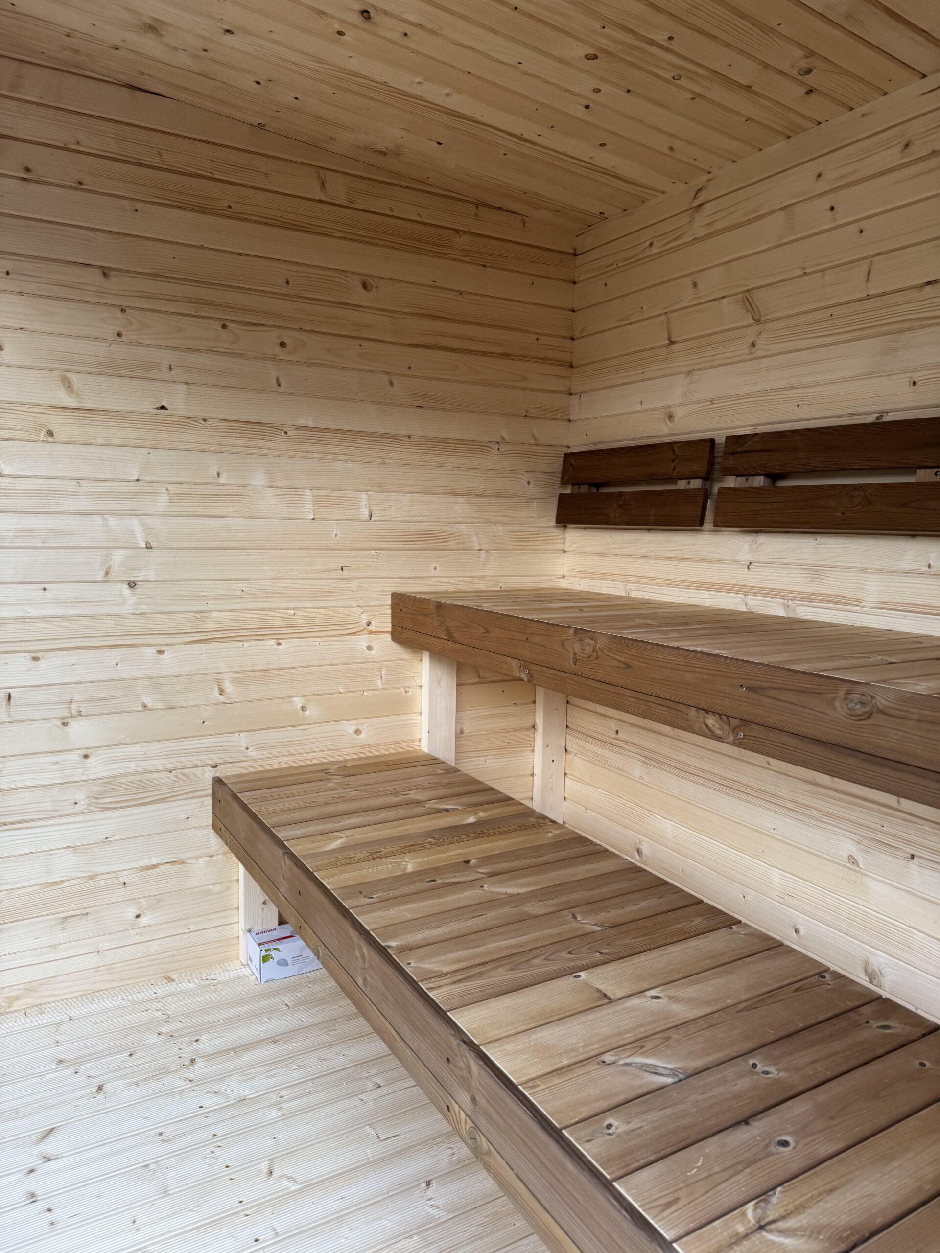 Badstuevegger og tak er laget av rå og solid 44 mm grantre, holdt sammen med not- og fjærskjøt og lange skruer. Konstruksjonen er sterk og veldig stabil, noe som gjør det trygt å løfte hele badstuen (dvs. for transport, for å endre plassering i hagen din, for å selge den i fremtiden osv.).