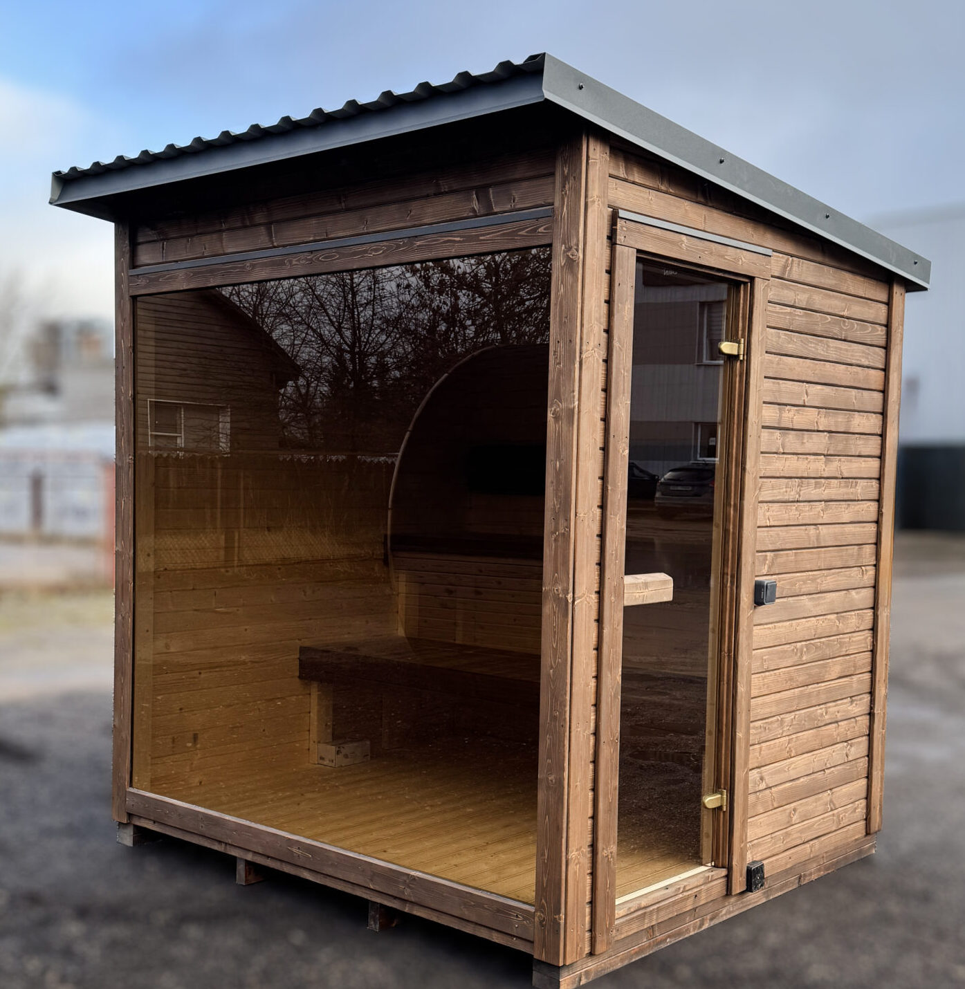 Badstue for 4 personer er en perfekt utendørs badstue i skandinavisk stil til hytte eller hage som er klar til bruk første dag etter levering. Badstuen har 2 benker (192×58 cm) innvendig, som lar 2 personer ligge eller 2-4 personer sitte i badstuen.
