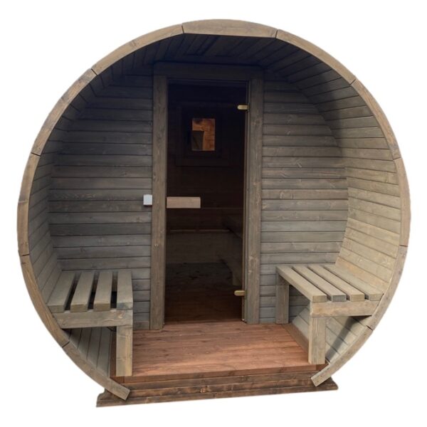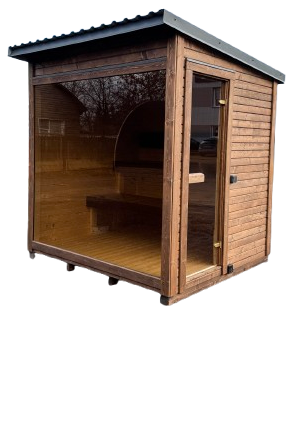KUBE badstuer laget for 4-6 personer. Det er to benker (226×58 cm) inne i badstuen. Badstuen er veldig kompakt, men likevel behagelig – Harvia M3 vedovn vil varme opp badstuen på under en time. Badstue har stort glass i fronten. Kan også leveres med tredør.