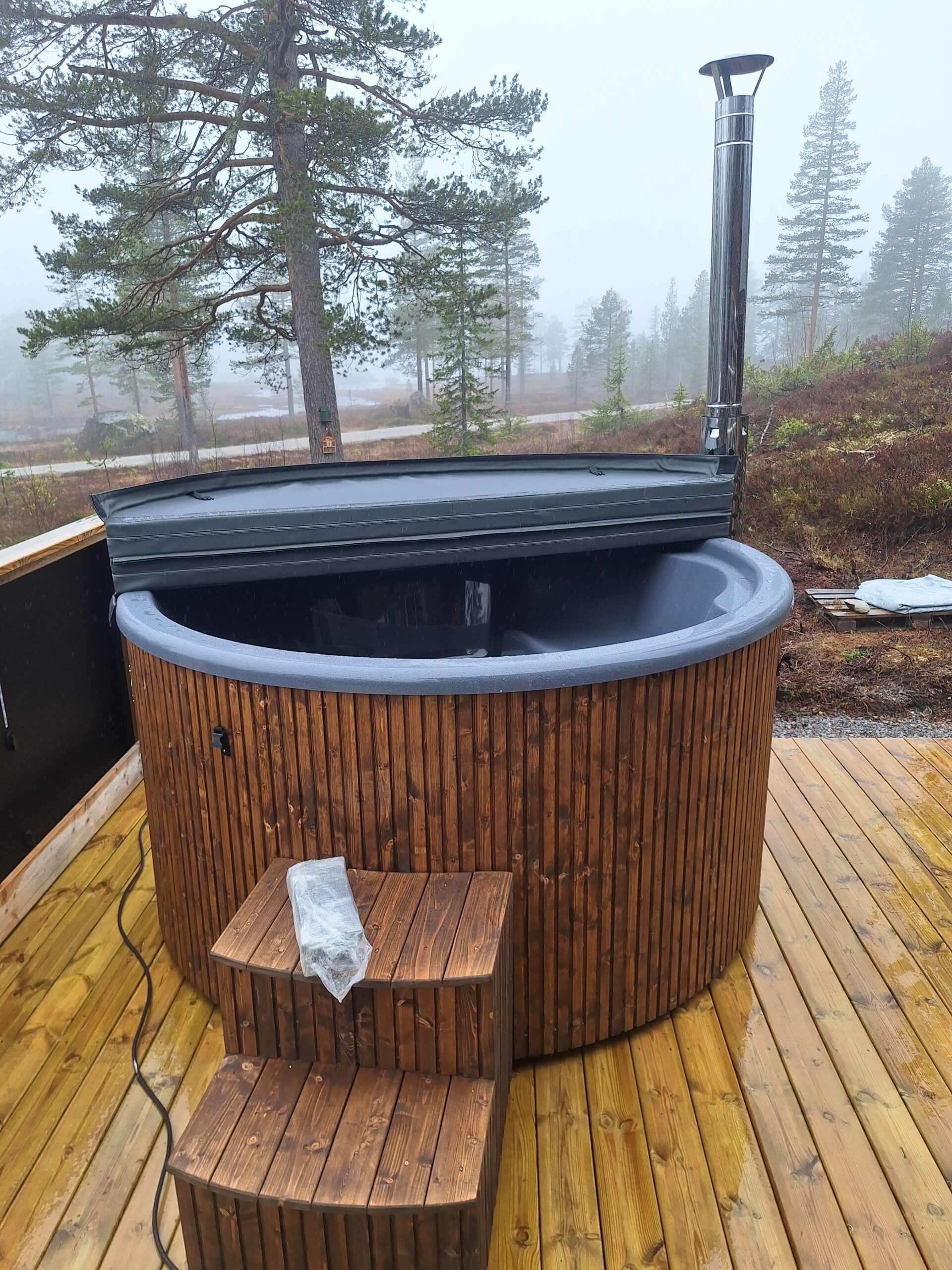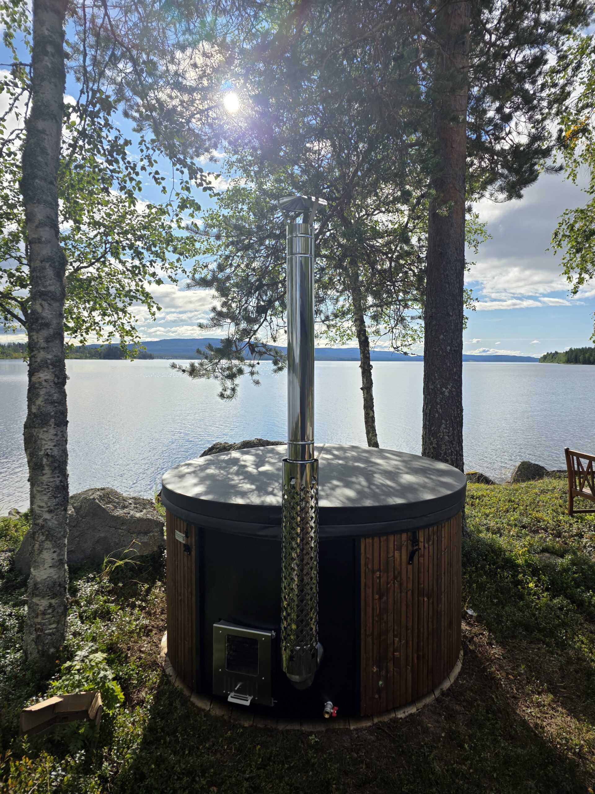 Badestamp i glassfiber med trekledning i ubehandlet grantre. Underramme er impregnert. Ytre diameter er 200 cm og 180 cm innvendig. Høyde 100 cm, dybde 85 cm innvendig. Volum ca 1000 liter. Badestampen passer fint for 4 – 5 personer. Oppvarming tar kun ca 2 – 2,5 timer. Oppvarmingstid varierier i forhold til luft- og vanntemperatur. Også kvaliteten på ved. Badestamp leveres ferdig montert.